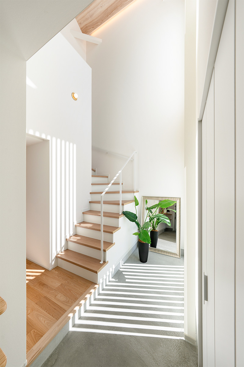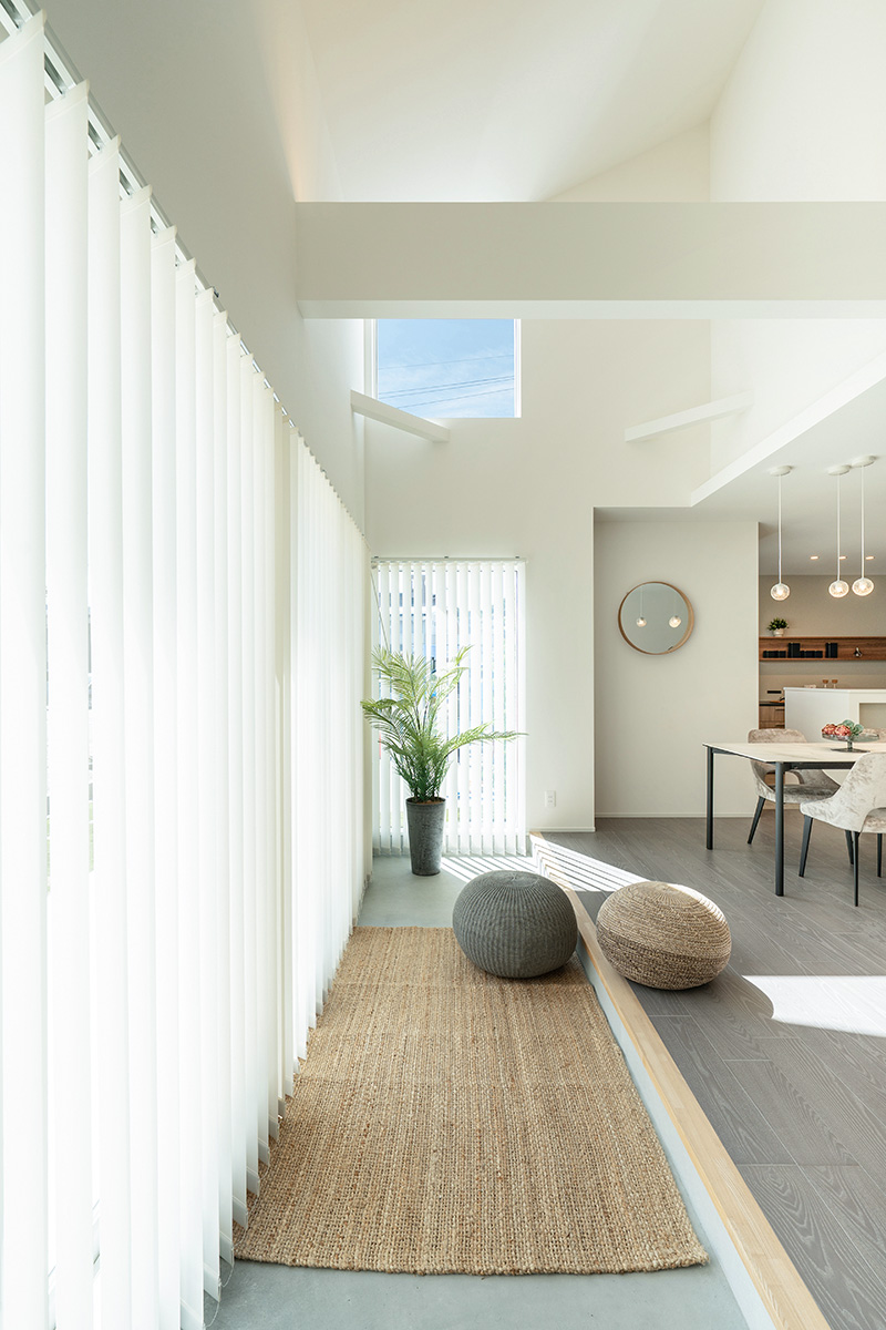 モダンテイストとやわらかな木目色が調和した、上品でエレガントなLDK。吹き抜けの土間リビングを中心に、LDKエリアと寝室・洗面などのプライベートエリアがゆるやかにつながります。