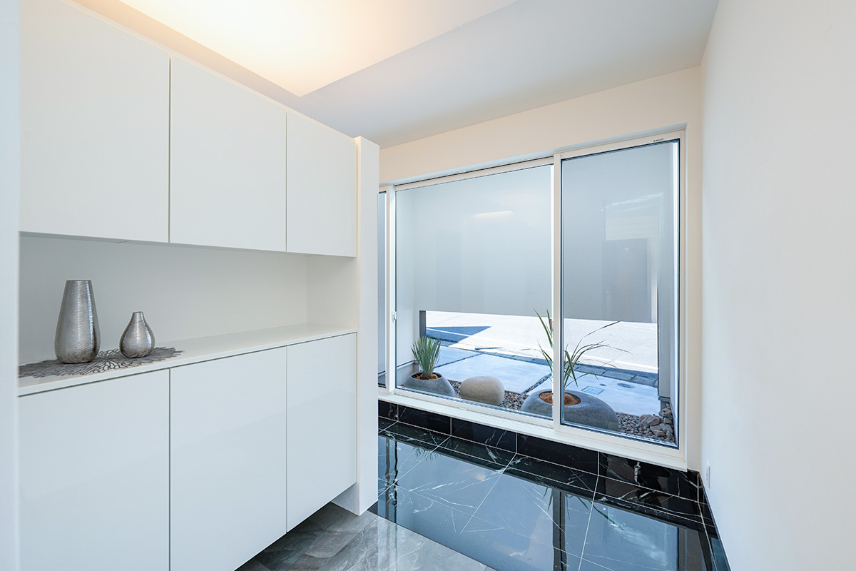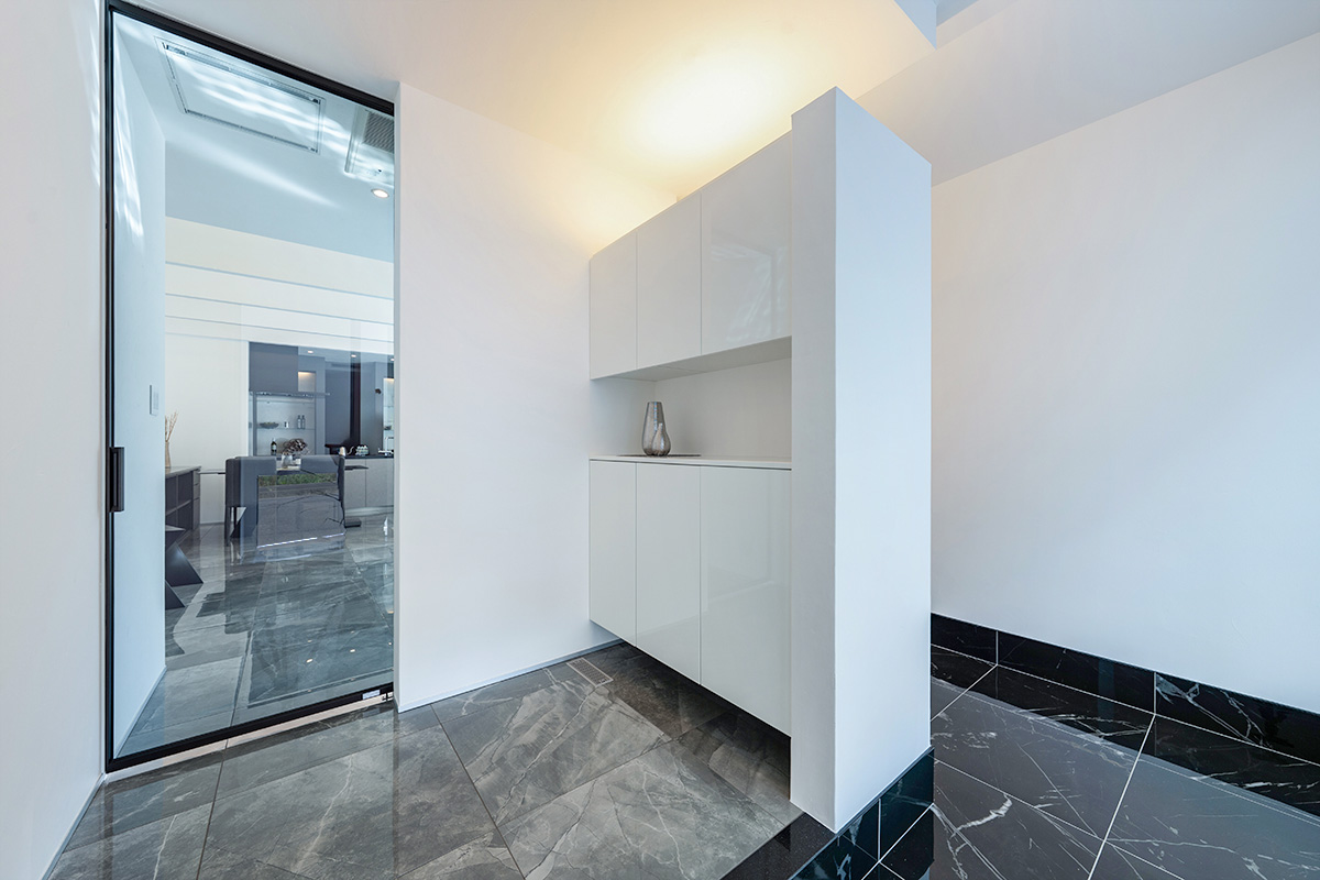 玄関ホールからリビングダイニングにかけて天井高を2964mmに設定し、ダイナミックな空間を実現。天井には連続するアーチ状の化粧梁を施し、間接照明が非日常空間を彩ります。床は大理石調のタイル貼りでラグジュアリーなLDKを演出。南側の庭に面した窓は中央がFIX状になった装飾引き違い窓を採用しており、ピクチャーウィンドウのように庭の景色を楽しめます。
